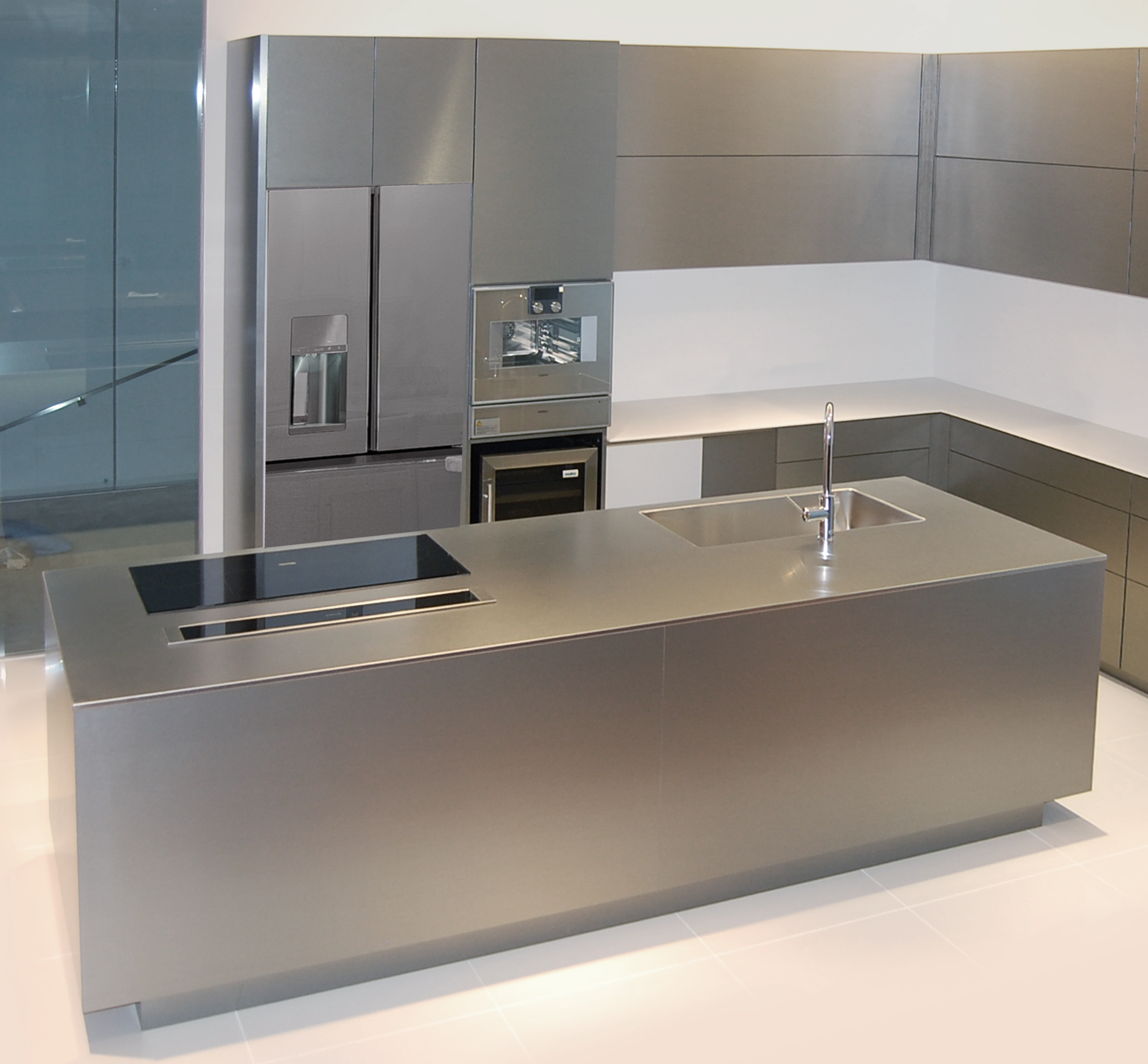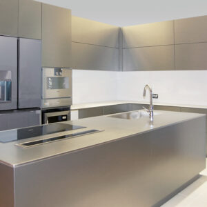 全ての部材をステンレスの質感に合わせ、究極の統一感を実現しました。エッジの効いたシャープなフォルムが、光を美しく反射し、キッチンを一つの芸術品へと昇華させています。機能美を追求した先に辿り着いた、潔いまでの美しさがここにあります。