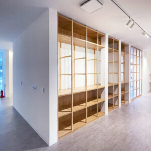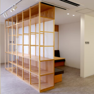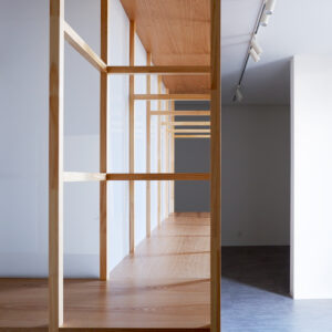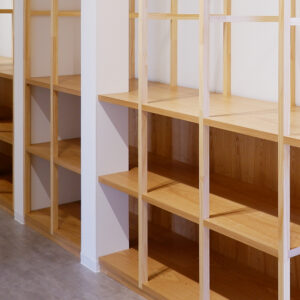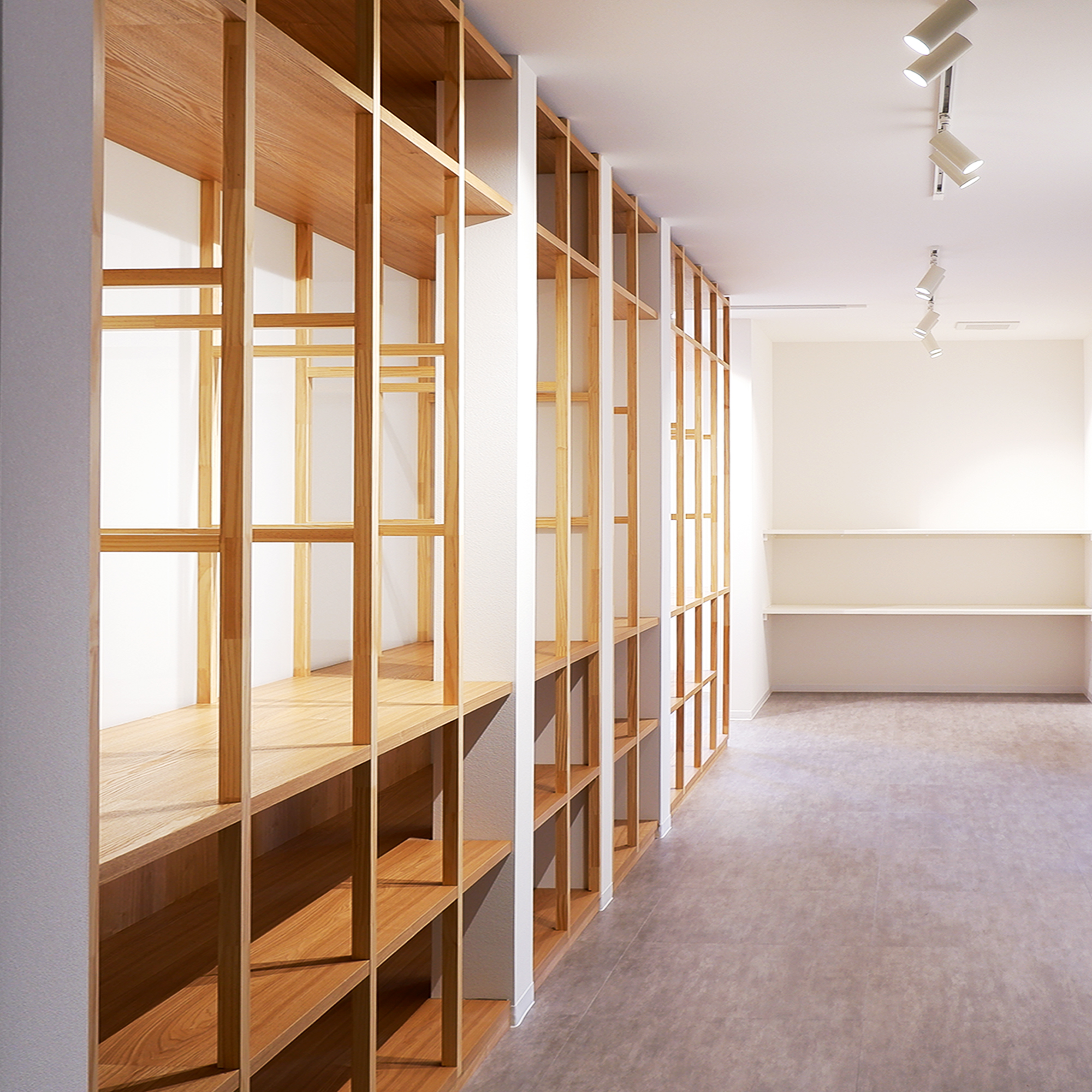 床から天井まで届く、圧倒的な存在感を放つ店舗用ディスプレイ家具です。最大の特徴は、表面に一切のビスを見せない熟練の組み上げ技術。視覚的なノイズを排除することで、木が本来持つ柔らかなぬくもりと、垂直に伸びる美しいラインを最大限に引き出しています。