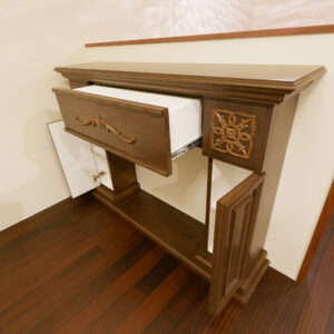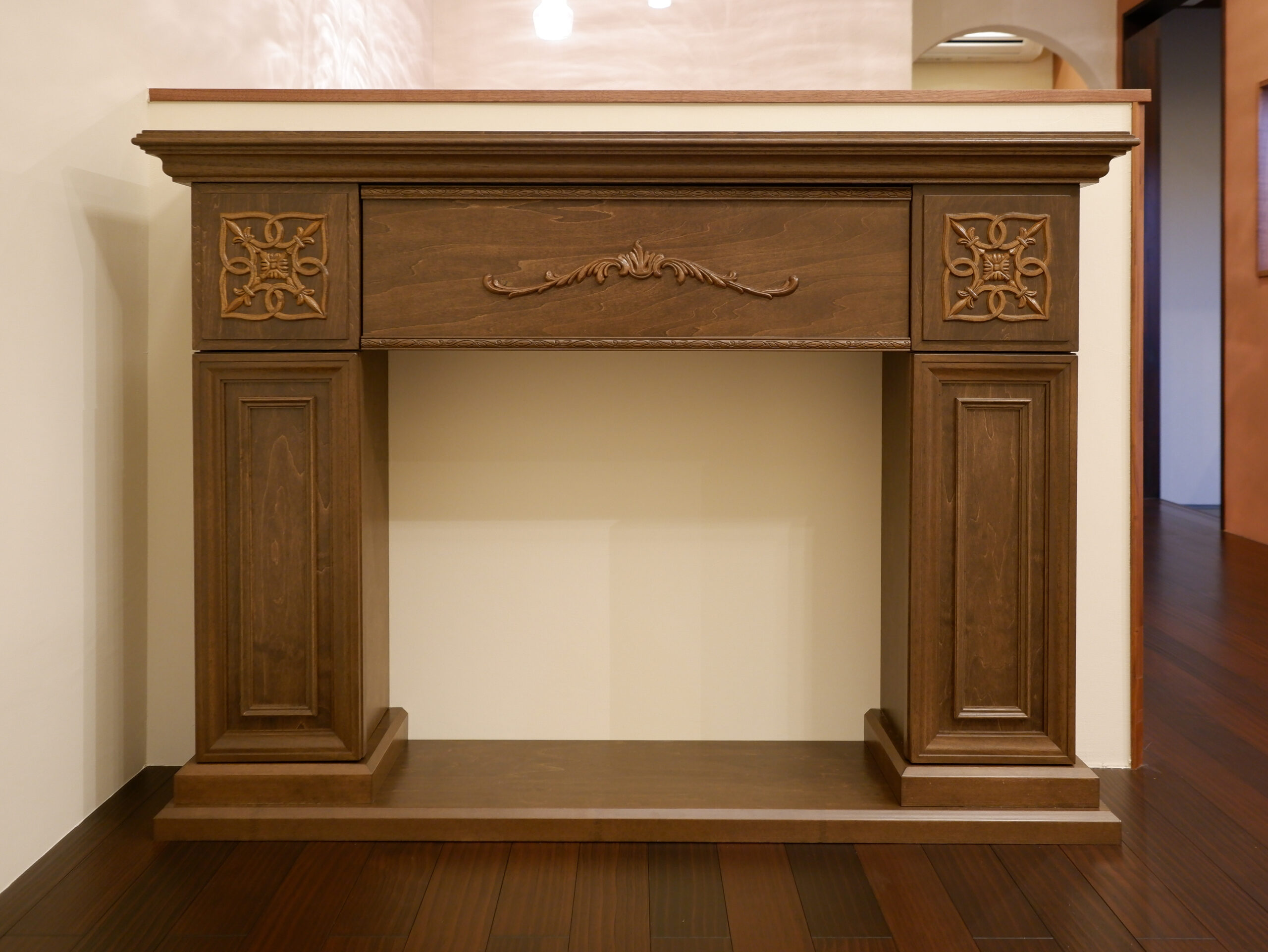 クラシックで重厚な佇まいを保ちつつ、実は引き出しや扉収納が隠されているという遊び心に溢れた一台です。意匠を崩さぬよう計算し尽くされた設計により、高いデザイン性と実用的な収納力を両立。訪れる人を驚かせ、オーナーの所有欲を満たす、唯一無二の造作家具が完成しました。