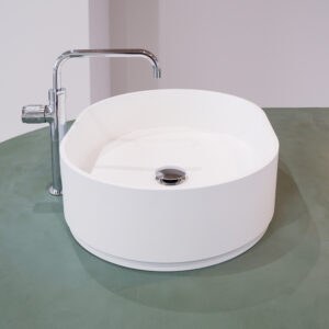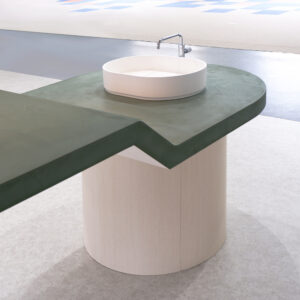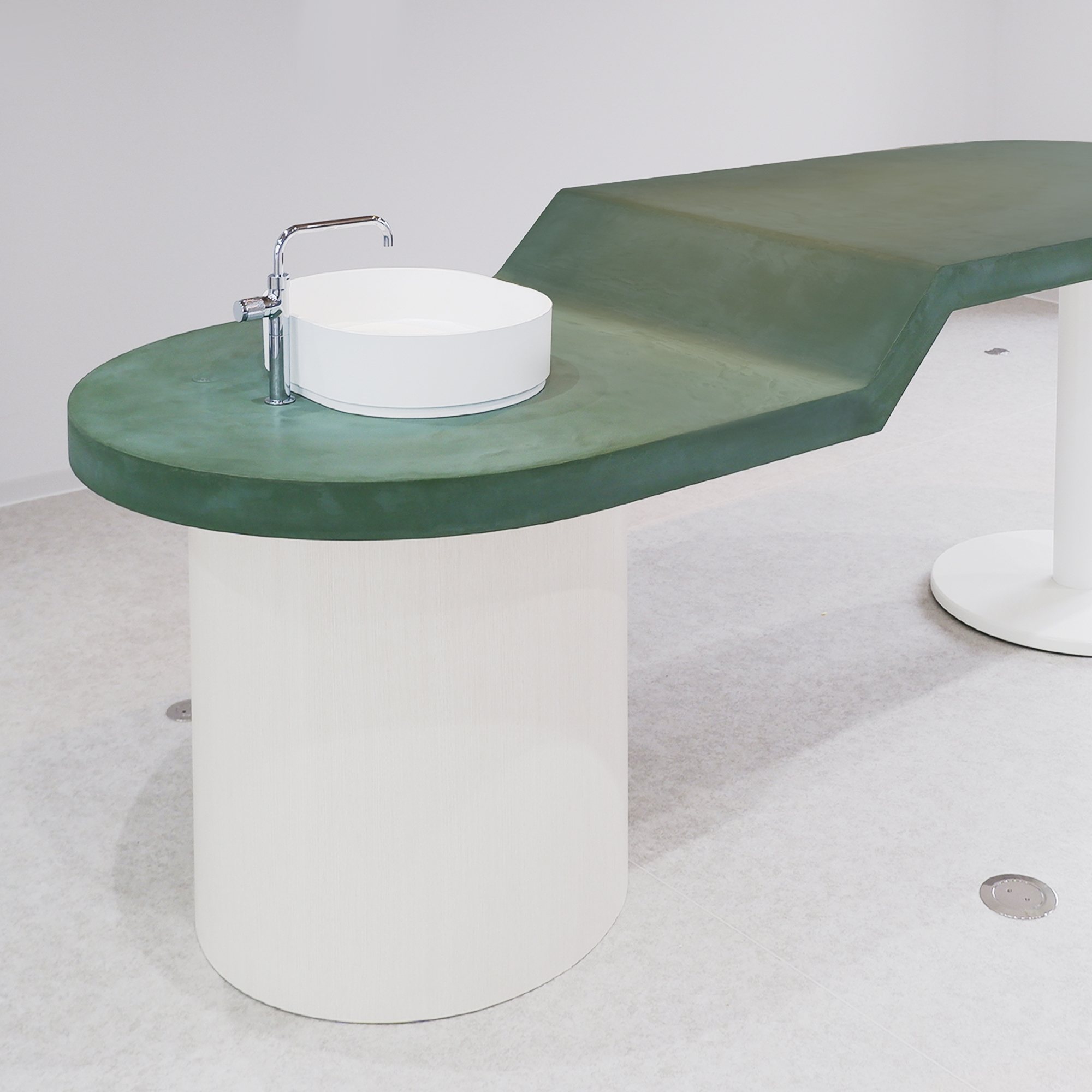 「創造的な対話が生まれる場にしたい」という要望を具現化するため、手洗いの機能と語らいのカウンターを一つの造形に昇華。モールテックスによる継ぎ目のない意匠が、作業と交流の距離を縮め、空間全体に心地よい一体感を生み出しています。大学という知の拠点にふさわしい、実験的かつ洗練されたプロダクトです。